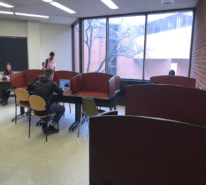 On the second floor of the Progress building right when you get off the stairs there is a cozy little spot that is normally pretty quiet which makes it the perfect space to study in. As you can see it also includes the chairs with the table attached them, which makes it easier for you to study and get your work done.